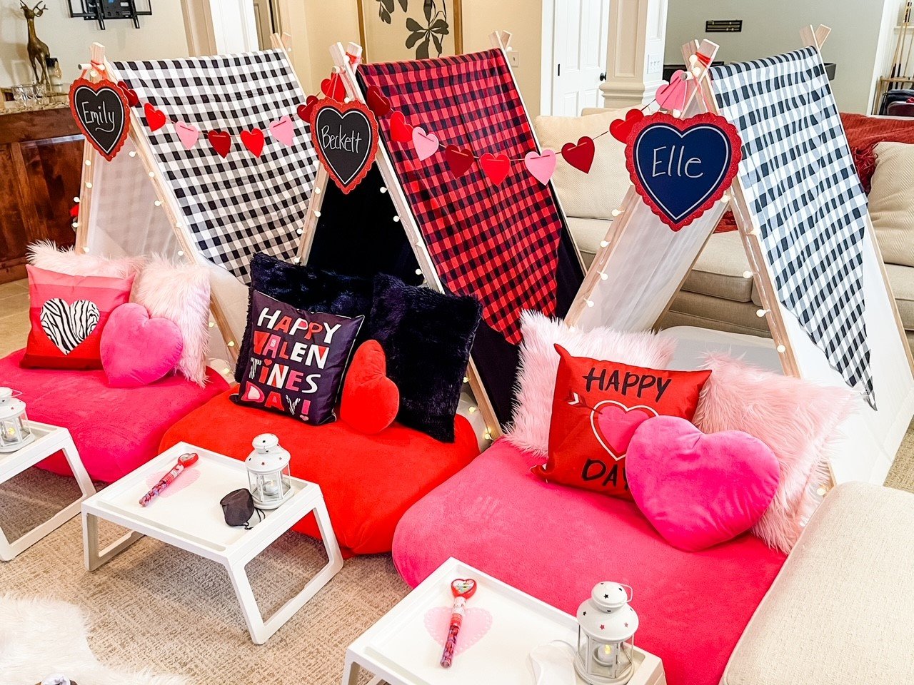 Pick ANY movie and hunker down in our cozy tents! Black velvet pillows accented with blue, red & yellow plus our signature ‘hideout’ netting make the perfect man cave to celebrate with your dudes!